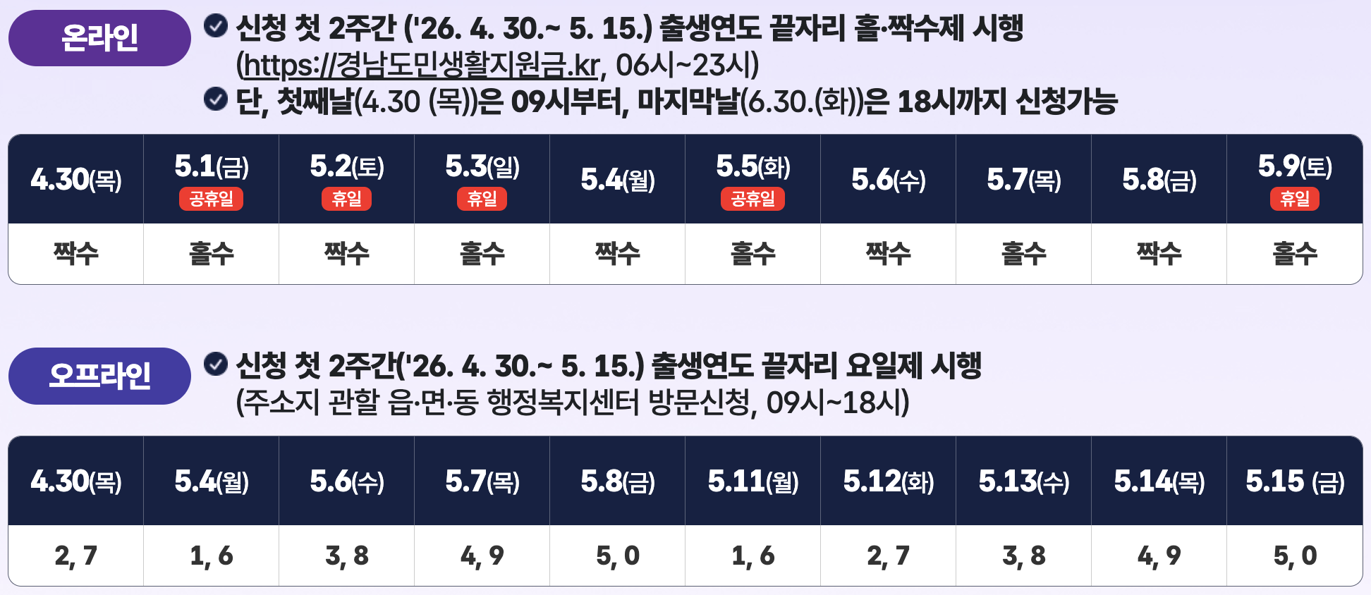 신청은 4월 30일(목)부터 시작됩니다. 처음 2주간은 원활한 신청을 위해 '홀짝제'와 '5부제'가 운영되니, 내 날짜가 언제인지 미리 체크해두시면 좋아요.
